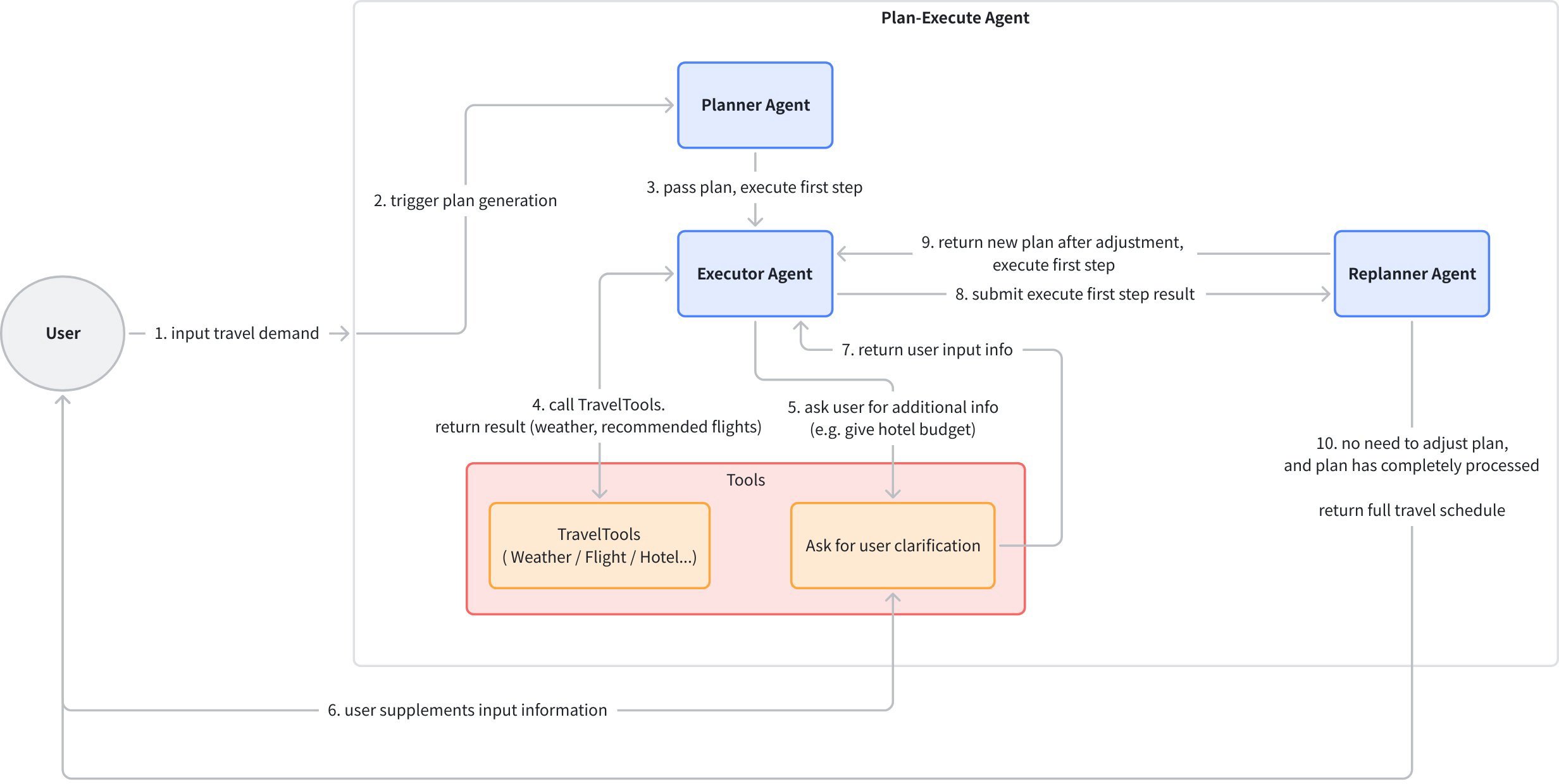 | plan‑execute example | This example implements a multi-Agent travel planning system using the plan-execute-replan pattern based on Eino ADK. The core function is to process complex user travel requests (such as "3-day Beijing trip, need flights from New York, hotel recommendations, must-see attractions") through a "plan-execute-replan" loop to complete tasks: 1. Plan: Planner Agentgenerates a step-by-step execution plan based on the large model (e.g., "Step 1: check Beijing weather, Step 2: search New York to Beijing flights"); 2. Execute: Executor Agentcalls mock tools **weather (get_weather), flights (search_flights), hotels (search_hotels), attractions (search_attractions)** to execute each step. If user input information is missing (e.g., budget not specified), it calls ask_for_clarificationtool to ask follow-up questions; 3. Replan: Replanner Agentevaluates whether the plan needs adjustment based on tool execution results (e.g., if no flight tickets available, reselect dates). Execute and Replan continuously loop until all steps in the plan are completed; 4. Supports session trajectory tracking (CozeLoop callback) and state management, ultimately outputting a complete travel plan. Structurally, plan-execute-replan has two layers: | ![]() |