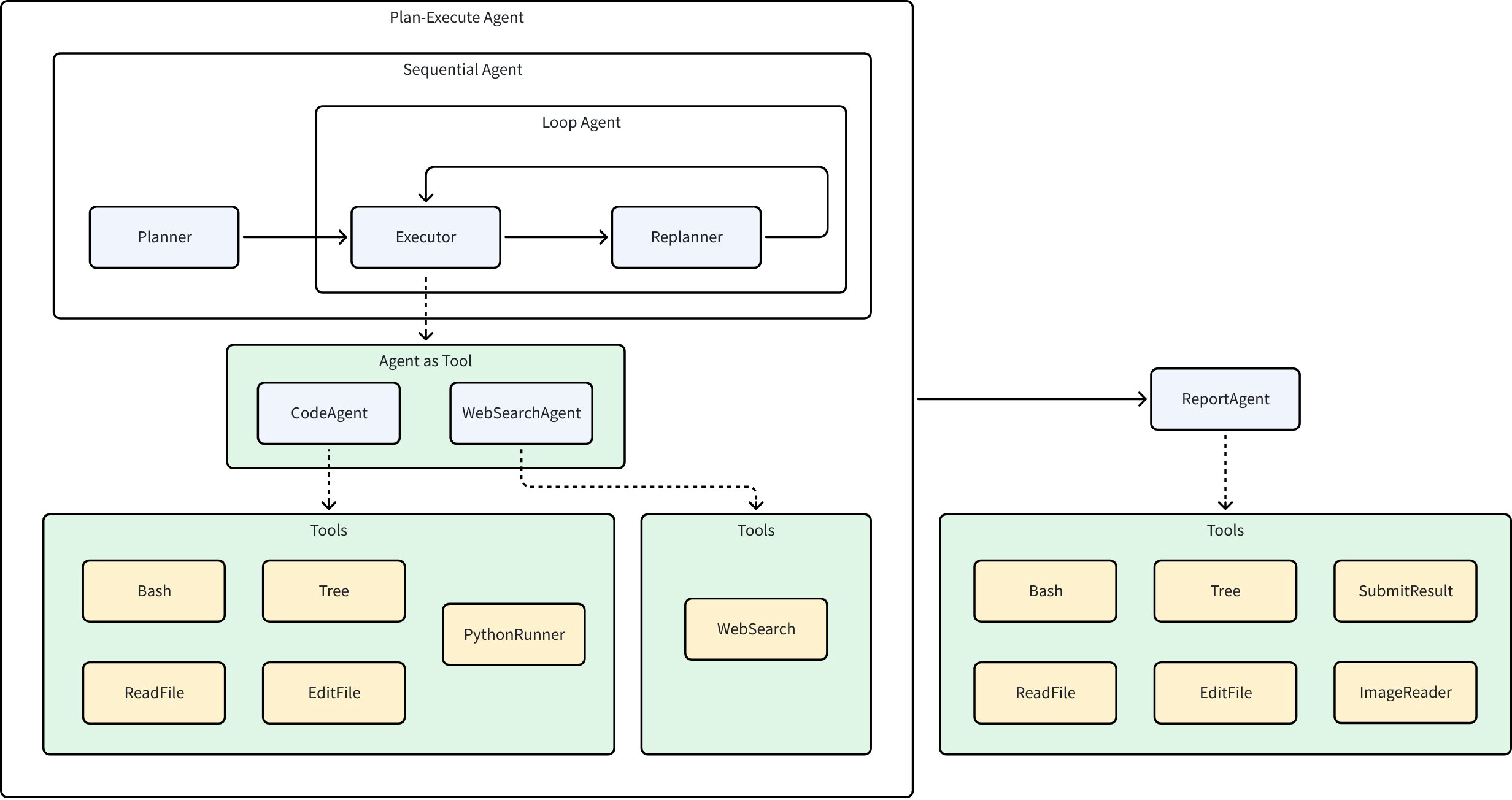- Executor: call tools (Excel reading, system commands, Python) to perform steps