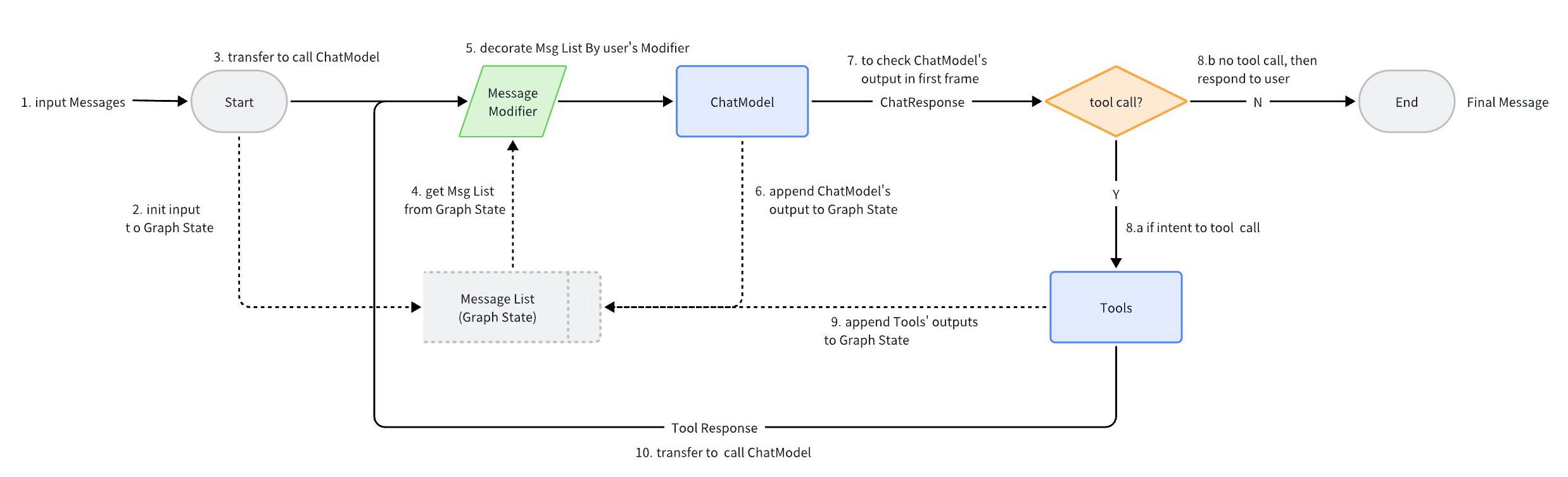 Example: a ReAct Agent — a ChatModel “binds” tools, receives Message input, reasons whether to call a tool or produce a final answer; tool results are fed back as Message for the next decision.