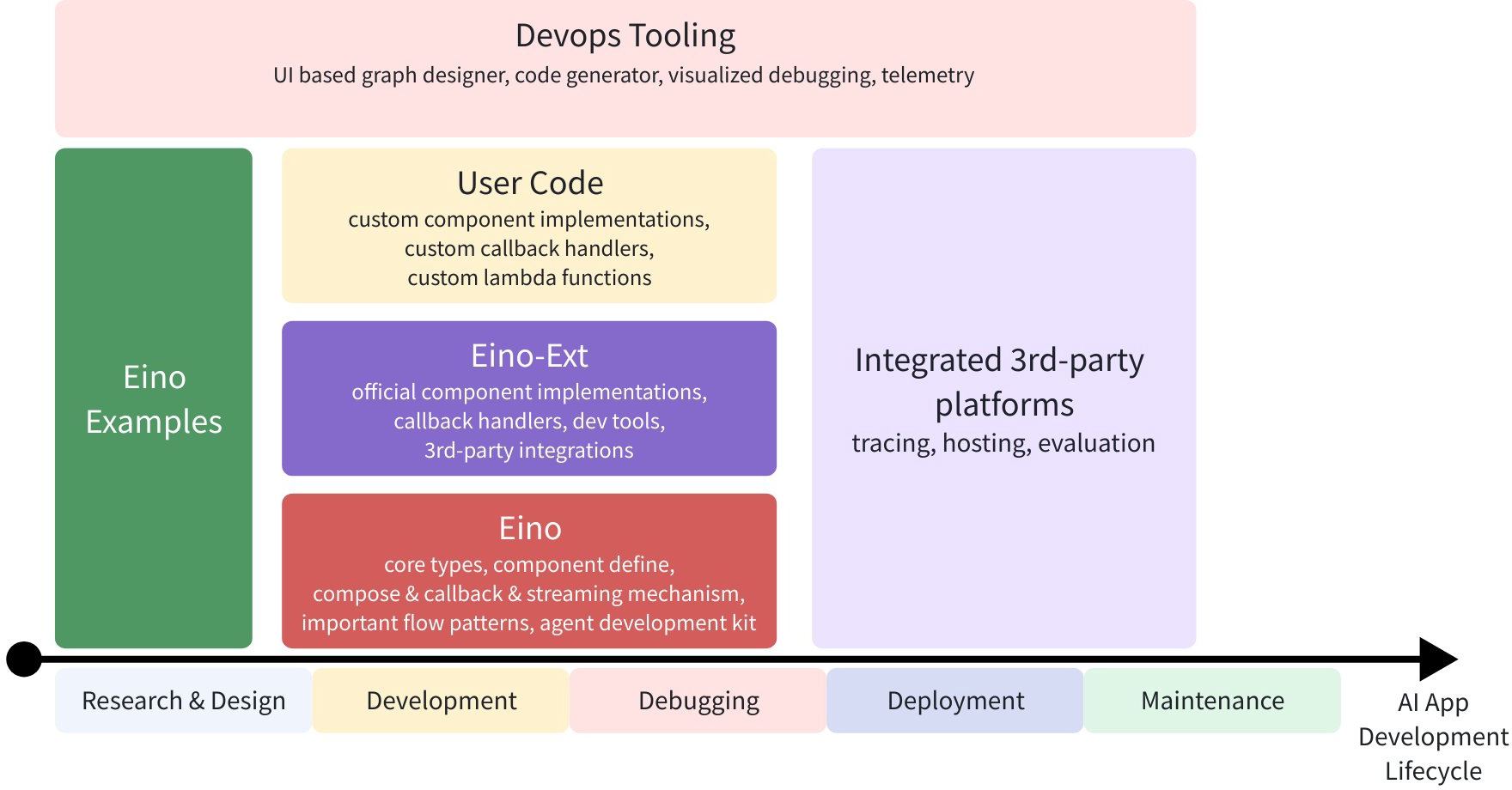 Eino is a devops-spanning framework — from best-practice samples (Eino Examples) to tooling for each stage: